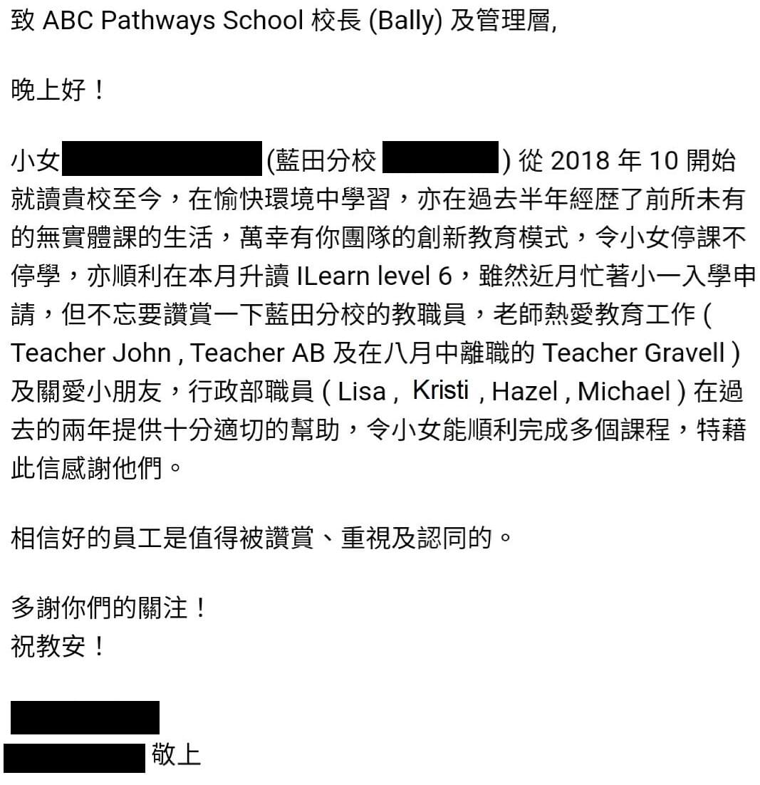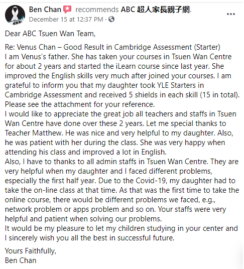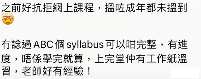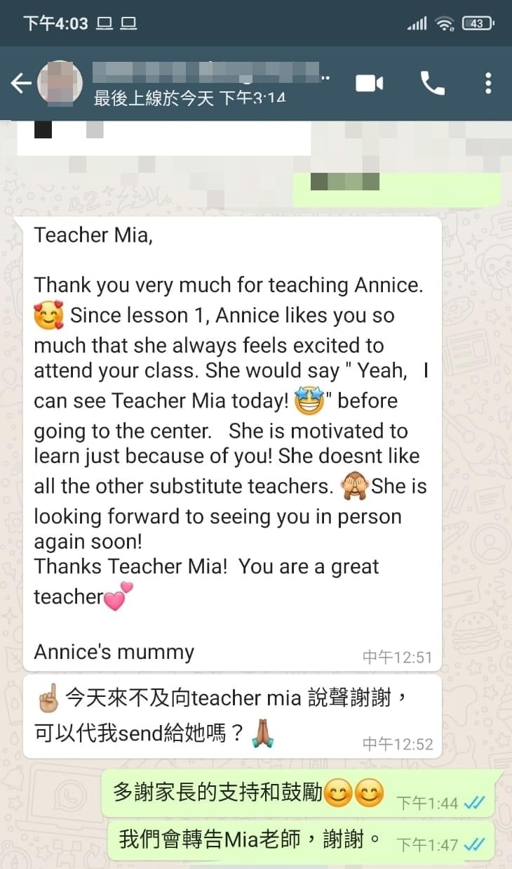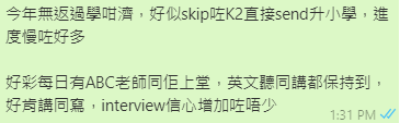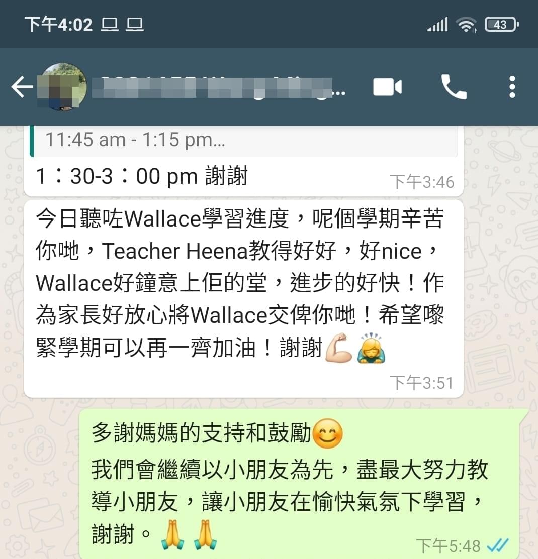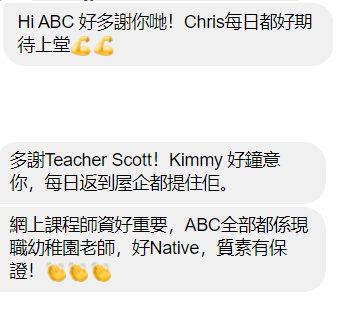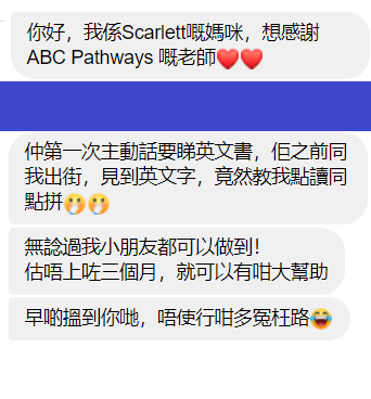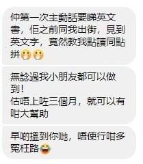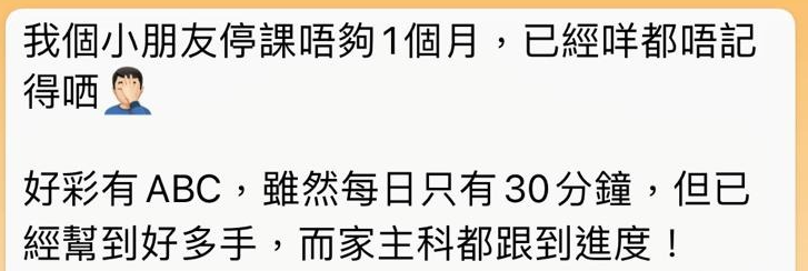 「進度比預期中好,相比咩都無學嘅同學仔,程度仲跟得上!囝囝囡囡本身學習能力不算高,吸收力和記憶力亦一般。我相信「不進則退」,所以每天持續給囝囝一點點學習時間,希望保持現有的英語水平,至少不會「倒退」 !